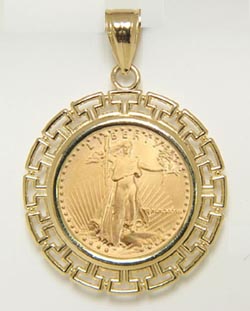 gold coin Greek Key bezel |